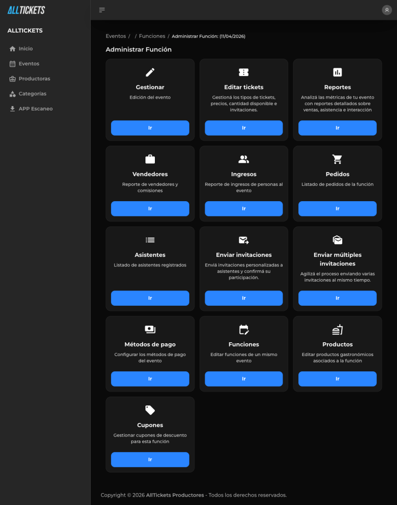 Desde esta interfaz los productores pueden gestionar todo el ciclo de vida del evento: