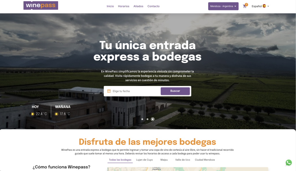 Para WinePass, desarrollamos una plataforma avanzada, reemplazando su sitio original en Wordpress con una solución moderna utilizando ReactJS, Node API y MySQL. Esta nueva versión está diseñada para mejorar significativamente la experiencia de usuarios y bodegas, tanto en dispositivos móviles como en escritorio.